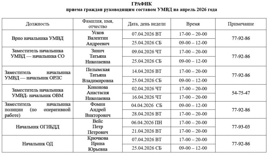 График приема граждан руководящим составом УМВД на март