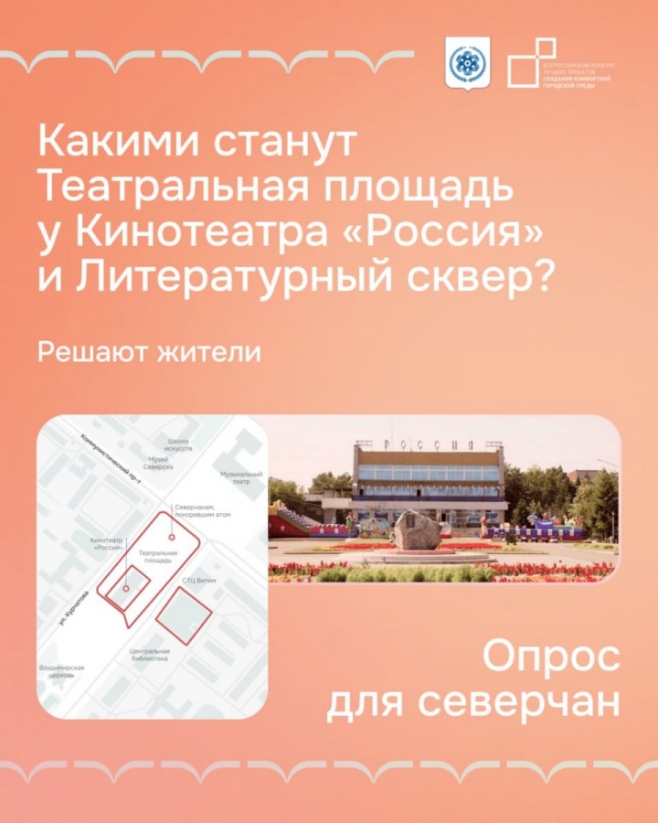 В 2026 году Северск вновь участвует во всероссийском конкурсе лучших проектов создания комфортной городской среды в малых городах и исторических поселениях. 28 января завершилась процедура выбора общественной территории благоустройства – в случае победы на конкурсе преобразятся театральная площадь у кинотеатра «Россия» и литературный сквер. Жителям Северска предлагается самим определить, какие изменения они хотели бы видеть, приняв активное участие в подготовке конкурсной заявки. Для этого необходимо заполнить анкету, подготовленную командой проекта, выразить свое мнение по поводу благоустройства и поделиться комментариями, идеями и пожеланиями: clck.ru/3SWUVG