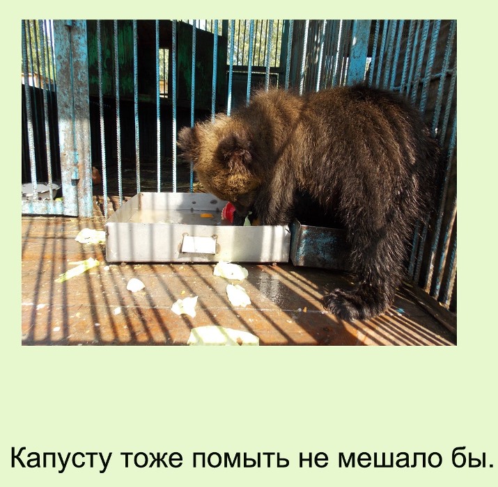 Уже больше двух месяцев живет в зоопарке медвежонок по имени Тишка (Тихон- по-взрослому). Медвежонок уже полностью адаптировался к жизни в неволе и стал любимцем публики. Сейчас он значительно вырос и больше времени проводит в активной деятельности, конечно, он любит вкусно поесть - кормят его все еще 6 раз в день (последнее кормление в 22 часа вечера), в рацион помимо молочных каш входит и много разных фруктов и овощей, а так же вареное мясо и рыба. Если кормление задерживается, то он начинает канючить как капризный ребенок и греметь тарелками, но, а если наелся, то может и поиграть с едой. После еды любит повозиться с резиновыми игрушками, лучше всего в тазу с водой - и прохладно и весело, а потом пойти спать, ведь сон для детей – очень важен.