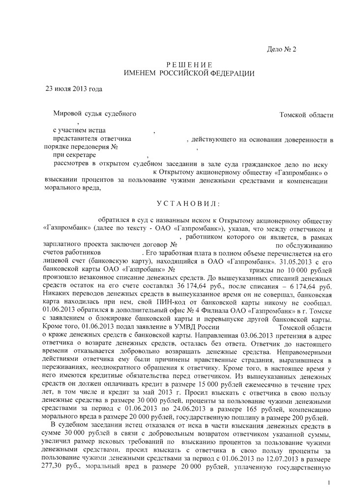 Ниже приведено решение мирового судьи о взыскании с ОАО "Газпромбанк" (Филиал в г.Томске) в мою пользу компенсации морального вреда и процентов за пользование чужими денежными средствами. Денежные средства в размере 30 000 рублей, которые были похищены у меня с банковской карты, ОАО "Газпромбанк" вернул самостоятельно после обращения в суд.