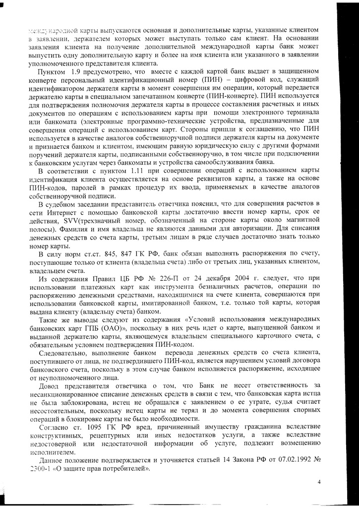 4. Ты сам когда-нибудь за что-нибудь расчитывался в интернете? Если читать решение мирового суда, то всё это было незаконно, ведь пин-код ты не вводил, тут я согласен с NoName. Если решение устоит в апелляции, то непонятно, как дальше будет работать интернет-торговля.