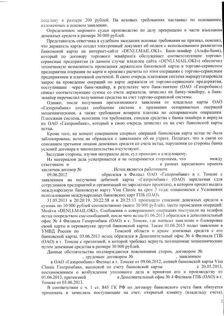 Я в Интернете вообще не совершаю никаких покупок с использованием своей банковской карты, на сайт dengi.mail.oki соответственно я не заходил, деньги списали посредством мошеннических операций (возможно с введением моих данных банковской карты). При списании денег мною были получены смс-сообщения с уменьшением баланса (в решении суда все написано).