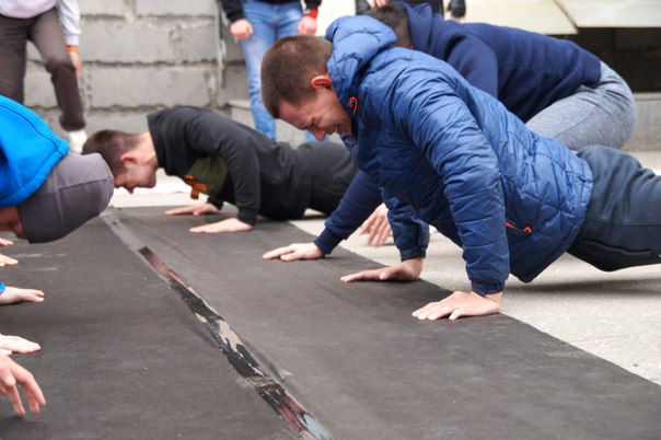 Покорить "Рекорд Победы" удалось за 50 мин. Завершилась акция дружным отжиманием под счет ведущего - 9 раз и громким «ура!». Всем участникам акции организаторы выразили слова благодарности и вручили сертификаты.