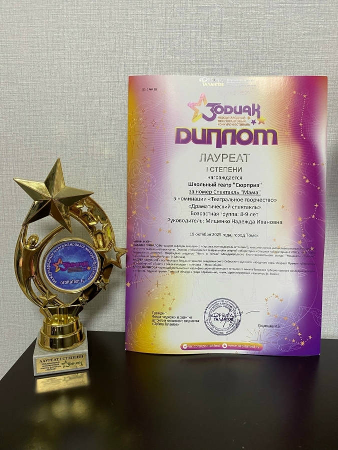 Младшая театральная группа школьного театра «Сюрприз» школы № 83 блестяще выступила на престижном состязании, представив свой спектакль «Мама» перед взыскательным международным жюри. Их выступление было отмечено высочайшей оценкой профессионалов и принесло заслуженную награду — звание лауреатов I степени. Такой успех — это результат не только природного таланта ребят, но и упорного труда, целеустремлённости и преданности искусству. Под руководством опытного наставника, Мищенко Надежды Ивановны, артисты смогли раскрыть свой потенциал и показать всё, на что способны.