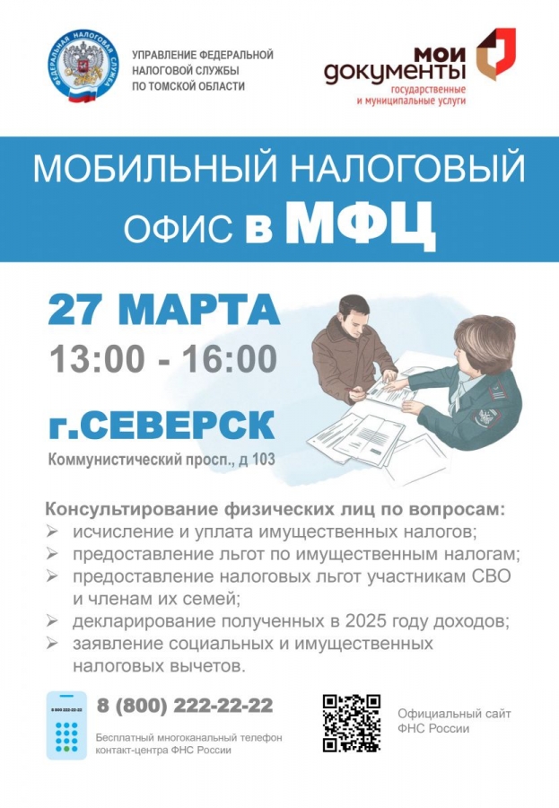27 марта на площадке Многофункционального центра предоставления государственных и муниципальных услуг г.Северска развернётся мобильный офис Налоговой службы.