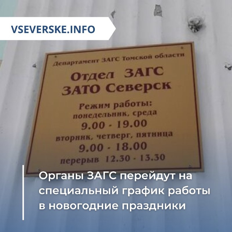 Северчане смогут обратиться в Отдел ЗАГС ЗАТО Северск (пр. Коммунистический, 42, 8 (3823) 901-095, 901-087) по вопросам регистрации рождения, смерти, иных актов гражданского состояния, а также получить повторные свидетельства и справки 3, 6 и 9 января с 9.00 до 17.00. Подать заявление о заключении брака можно в любой из праздничных дней через портал госуслуг, не обращаясь лично в орган ЗАГС. С 12 января ЗАГСы Томской области вернутся к обычному графику работы, Дворец бракосочетаний города Томска — с 13 января.